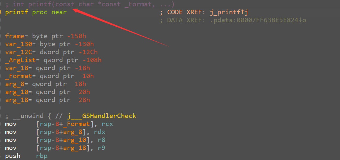 而且上一个例子中,我们调用的 printf 函数其实是存在在 exe 本身中的,但是如图,上面这一小行字就是他的函数原型,因此 ida 能够识别
