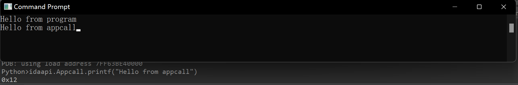 idaapi.Appcall.printf("Hello from appcall")